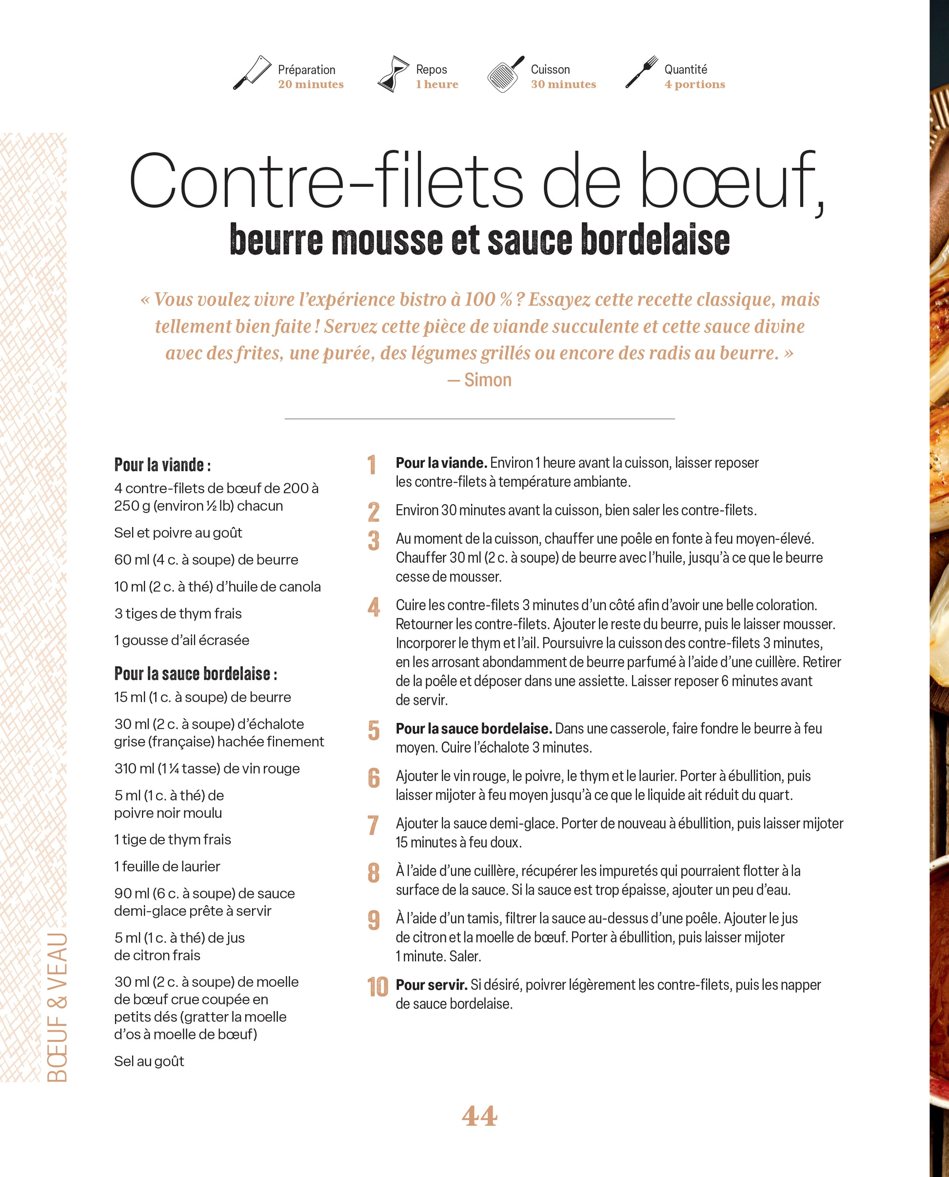Parce qu’apprécier une viande, ce n'est pas seulement la déguster : Comme au bistro est une invitation à redonner toutes ses lettres de noblesse à la protéine animale. Reconnecter avec la matière première et lui faire honneur, voilà l’essence de ce livre signé Le Boucan, boucherie et traiteur. Avec ses acolytes, Simon Giguère nous propose plus de 75 recettes gourmandes, généreuses et, surtout, accessibles pour mettre en valeur la viande de boucherie.