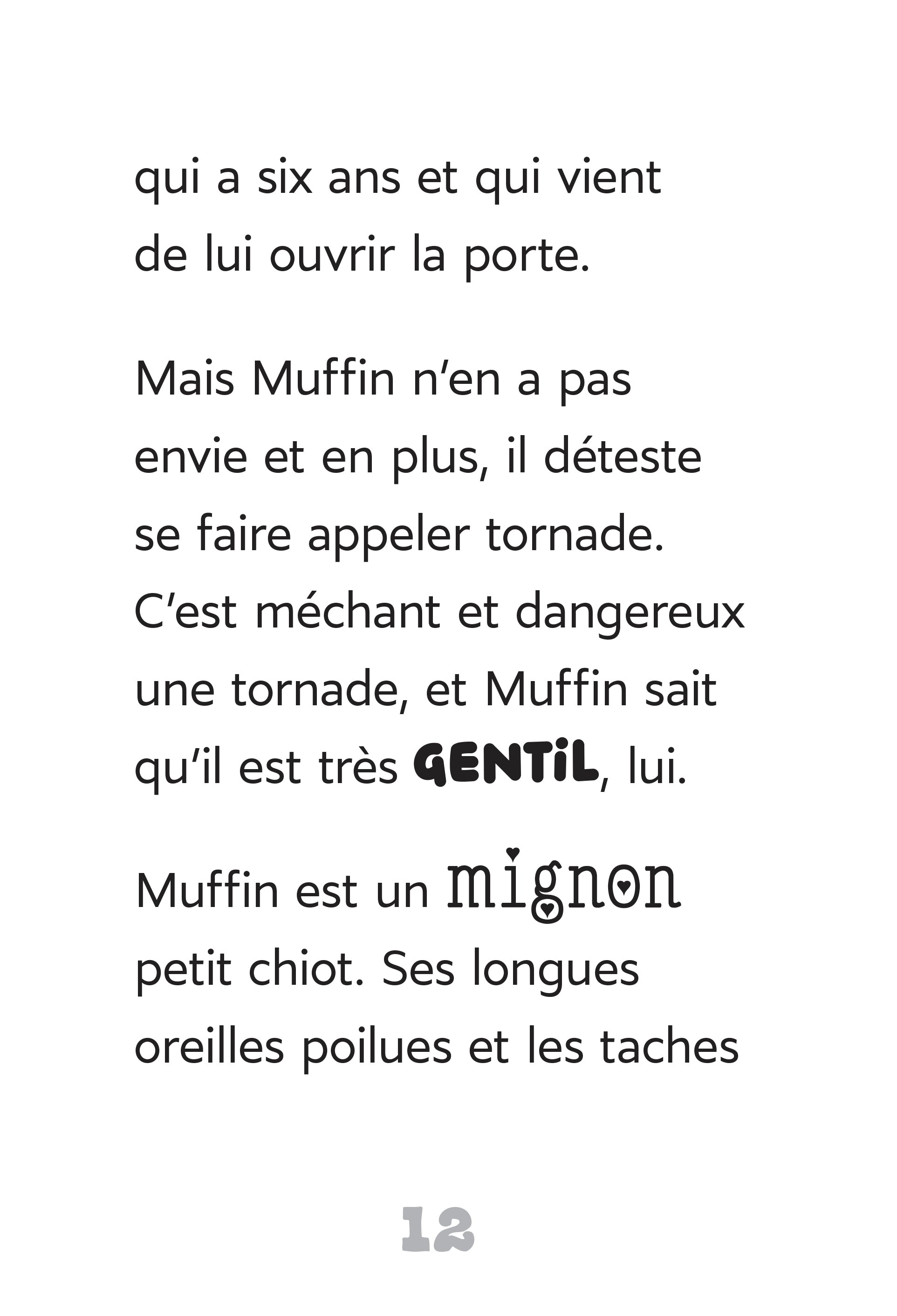 d’escampette. Mais comme il n’est jamais sorti de sa cour, il ne reconnaît plus du tout les alentours. En cherchant sa maison, il fera la rencontre de Charlotte, qui deviendra vite sa nouvelle meilleure amie, et de Miss Princesse, qui est un peu grincheuse, mais très généreuse. Dans sa cavale, Muffin découvrira qu’il y en a des choses dehors !