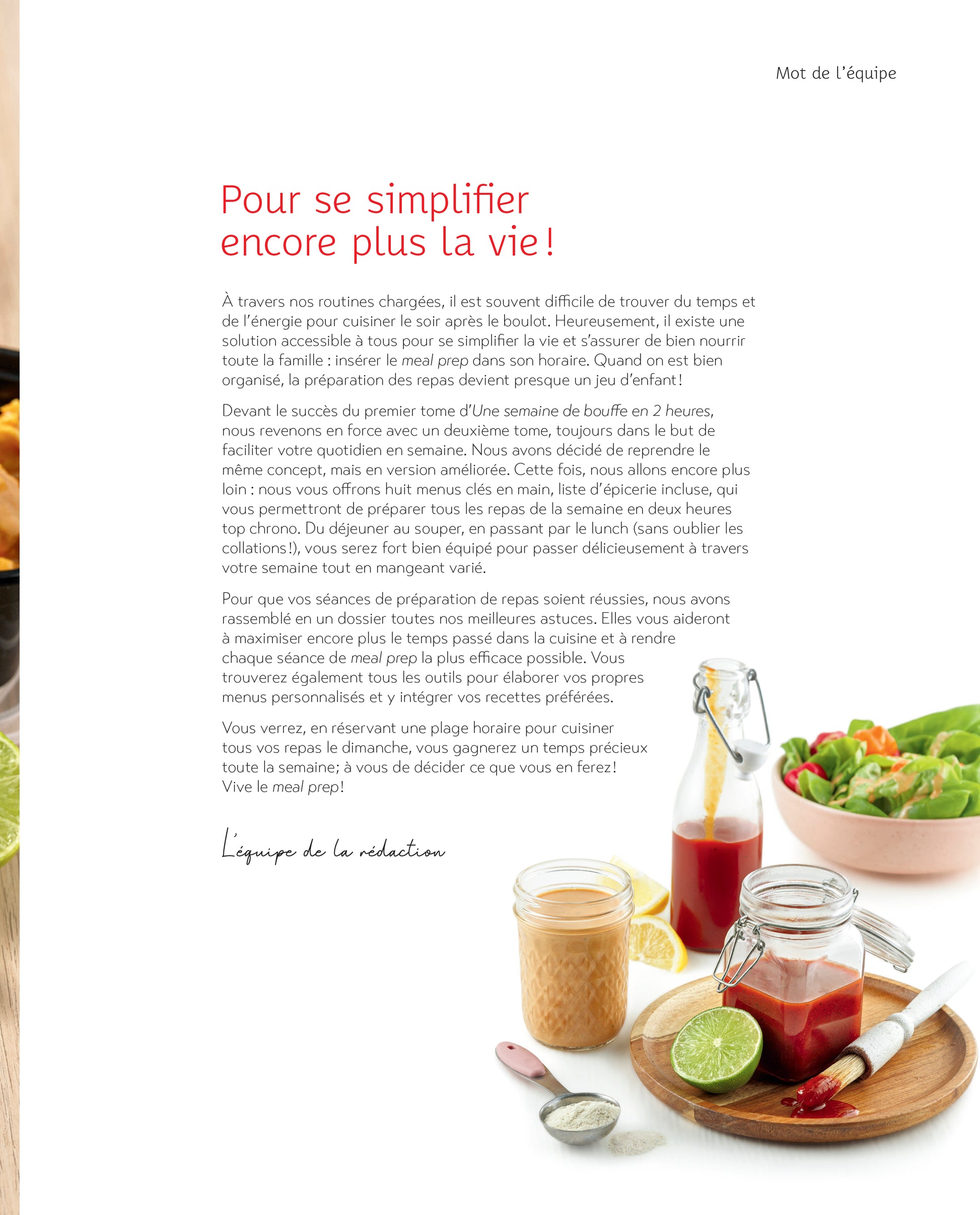 Devant le succès du premier tome d’Une semaine de bouffe en 2 heures, nous revenons en force avec un deuxième tome, toujours dans le but de faciliter votre quotidien en semaine. Nous avons décidé de reprendre le même concept, mais en version améliorée. Cette fois, nous allons encore plus loin : nous vous offrons huit menus clés en main, liste d’épicerie incluse, qui vous permettront de préparer tous les repas de la semaine en deux heures top chrono. Du déjeuner au souper, en passant par le lunch (sans oublier les collations !), vous serez fort bien équipé pour passer délicieusement à travers votre semaine tout en mangeant varié.